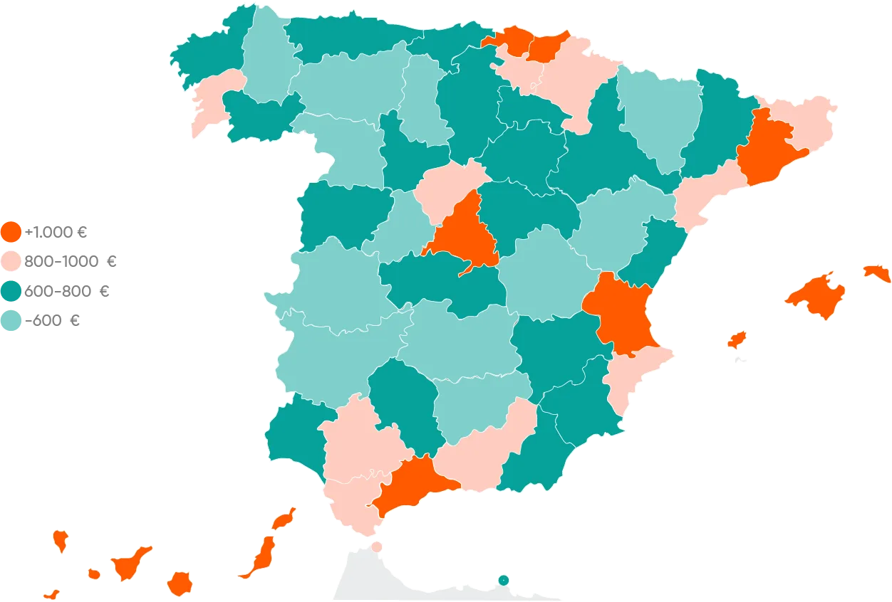 Por encima de los 900€, destacan los casos de Navarra (992€), Álava (988€), Girona (959€), Alicante (949€) y Sevilla (915€); y entre los 800 y los 900€, se encuentran zonas como Segovia (873€), Granada (827€), Tarragona (811€), Cádiz (810€), Pontevedra (806€) y Ceuta (803€).