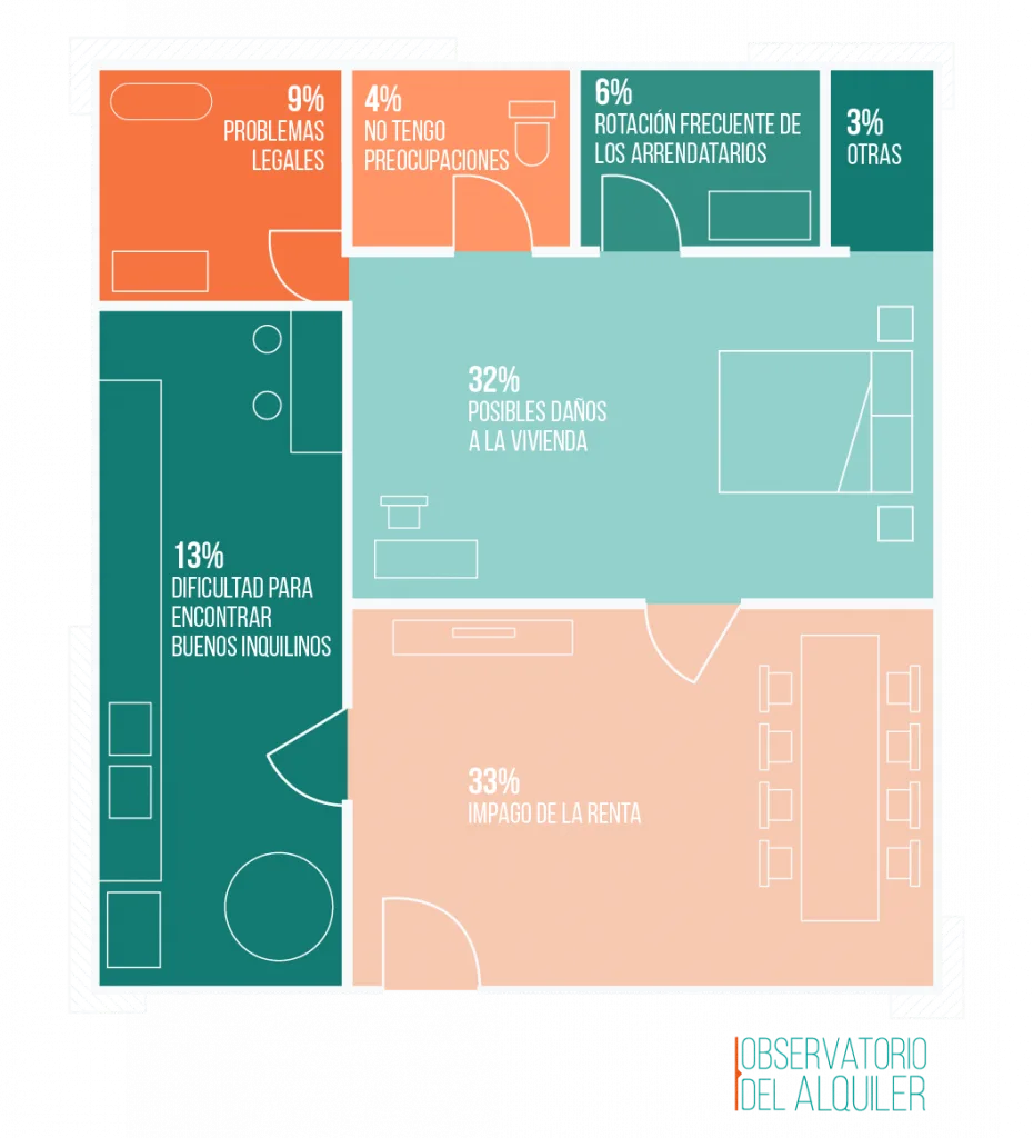 Otro tipo de preocupaciones que también destacan son la dificultad para encontrar buenos inquilinos (13%), los problemas legales (9%) o la rotación frecuente de los arrendatarios (6%).