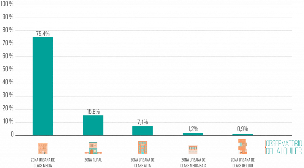 Las viviendas principales de los propietarios españoles, además de su régimen de tenencia, se encuentran, sobre todo, en zonas urbanas de clase media. Se trata de un 75,4%. También hay un porcentaje significativo de arrendadores que residen en zonas rurales. Son el 15,8%. Los propietarios que viven en zonas urbanas de clase alta y de lujo solo representan el 8%.