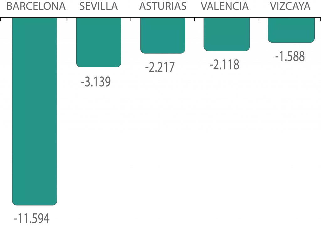 El desplome de la oferta muestra dinámicas territoriales muy marcadas. Barcelona es el caso más significativo, concentrando el 34,7% de la caída total del stock en España con 11.594 inmuebles menos. Destaca también la situación de Sevilla (-13%), una provincia con niveles de oferta históricamente bajos en relación a su población, ahora con una pérdida de oferta de más del 10%.