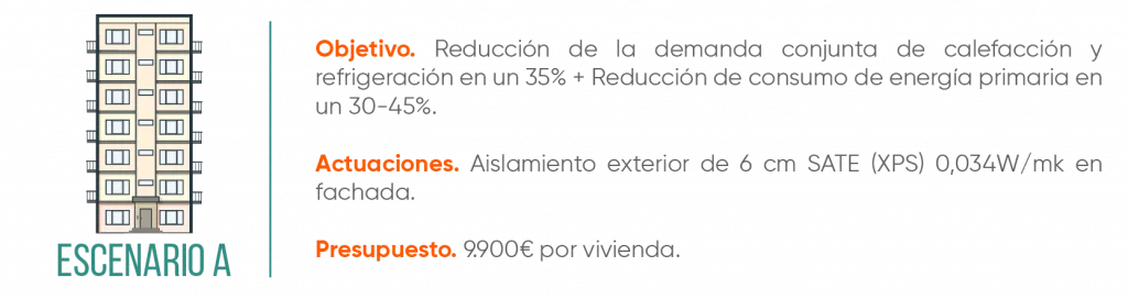 Si la comunidad de propietarios se propusiera hacer reformas para disminuir la demanda conjunta de calefacción y refrigeración del edificio en un 35%, así como reducir el consumo de energía primaria entre un 30 y un 45%, la inversión estimada que requeriría es de unos 9.900€ por vivienda.