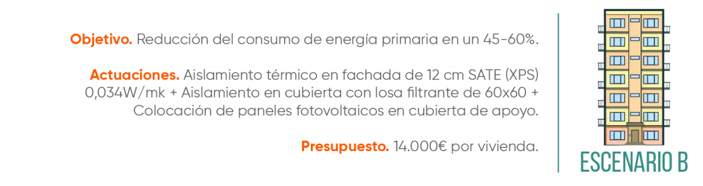 Si quisiera ir un paso más allá, y se planteara unos objetivos mayores de reducción del consumo de energía primaria entre un 45 y un 60%, requeriría unas actuaciones más complejas, con un presupuesto estimado de unos 14.000€.